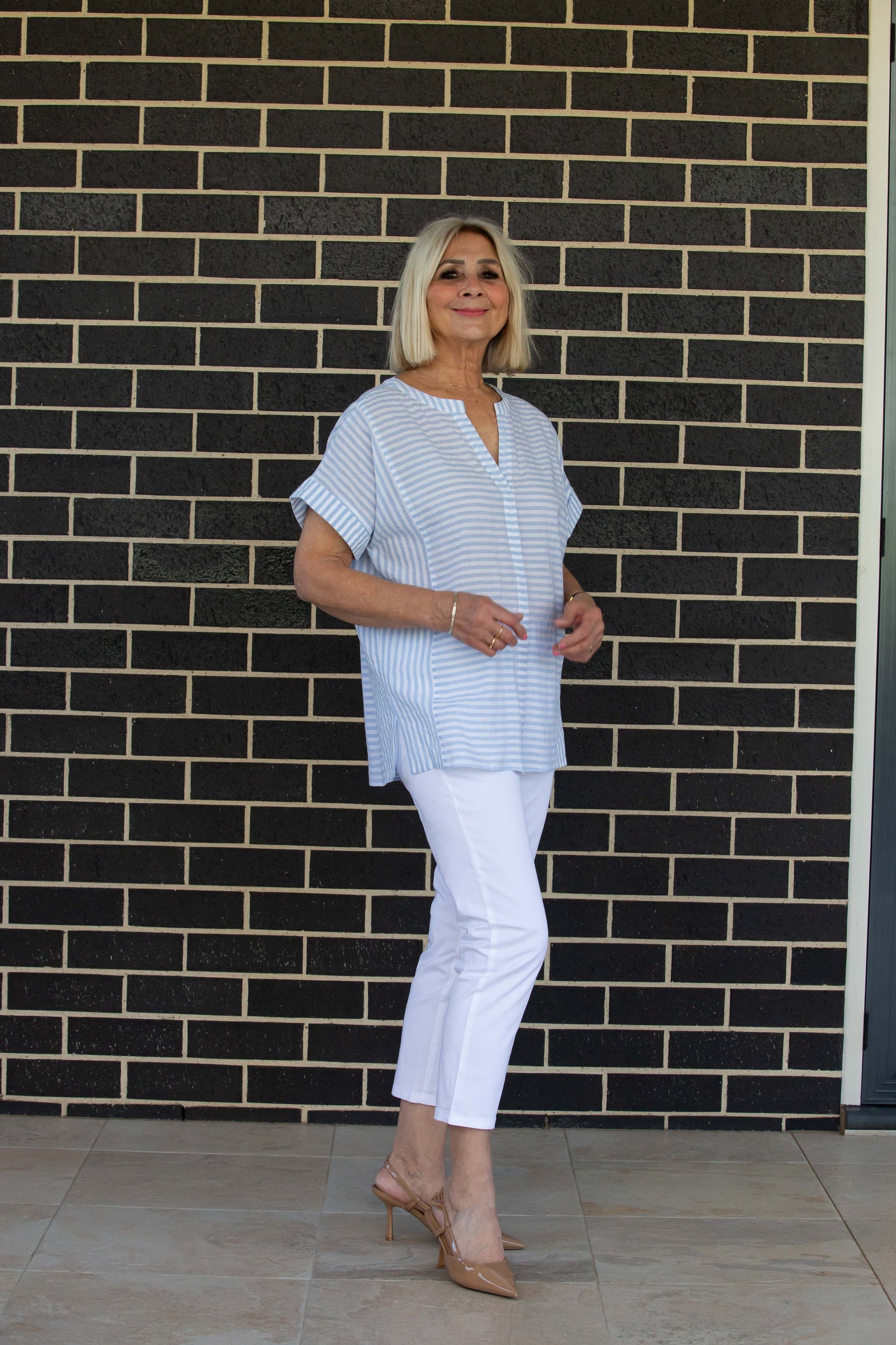Relaxed fit Cotton Blend Contrast Stripe Extended Sleeve Top #3638 - Blue/White