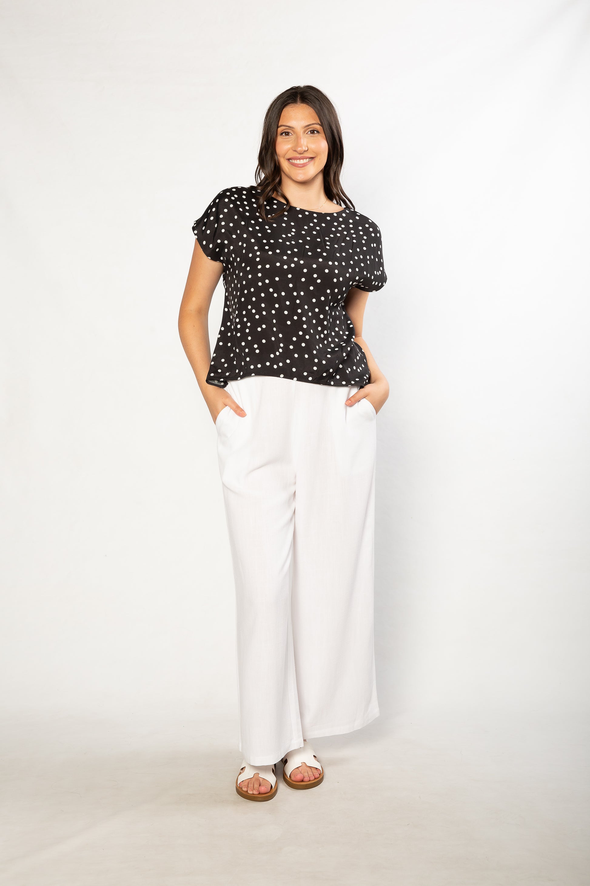 Spot Print Cap sleeve Top with curved hem and notch neck - #616 Black/White
