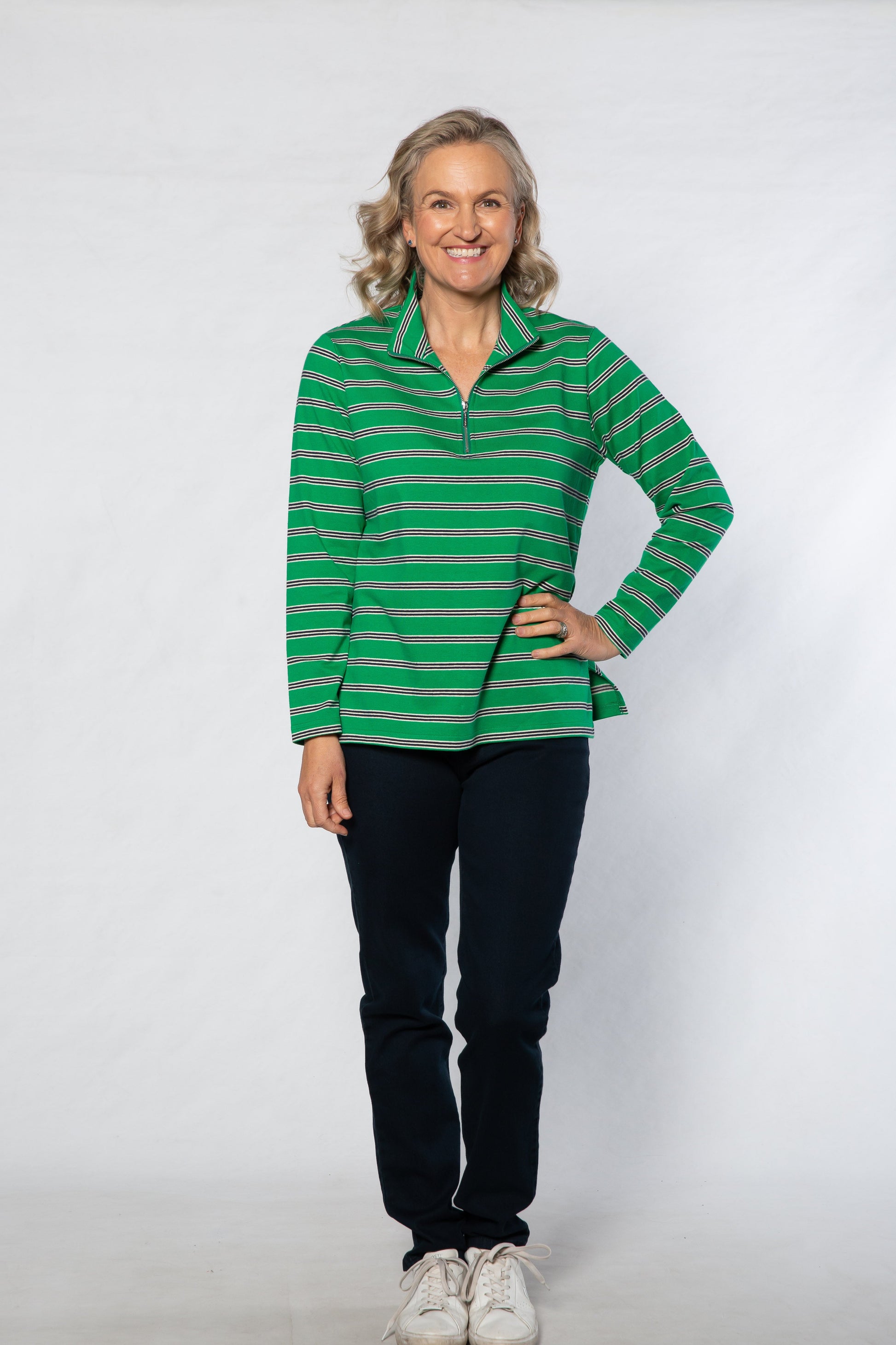 Cotton Stripe Knit Polo Top with half zip opening #297 Green/Navy
